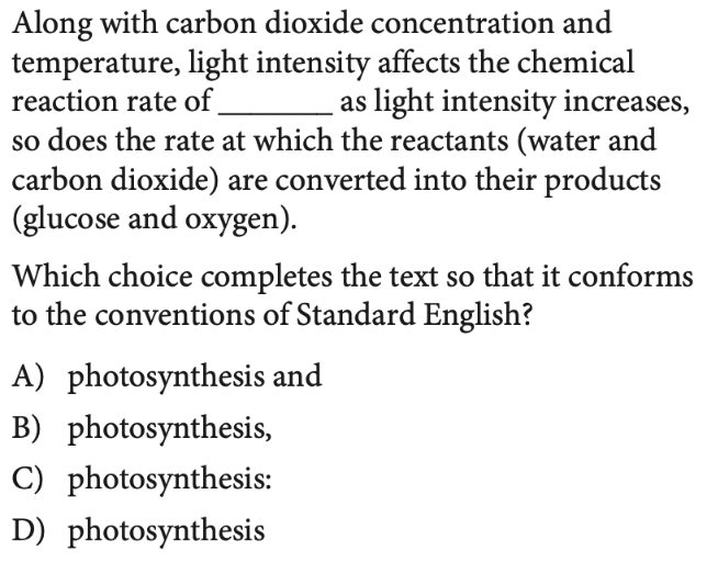 Grammar mechanics questions: On these questions, students are again faced with 1-2 sentences that include an omitted portion; in this case, however, they are required to fill in that blank with the grammatically correct construction from among the choices offered.
