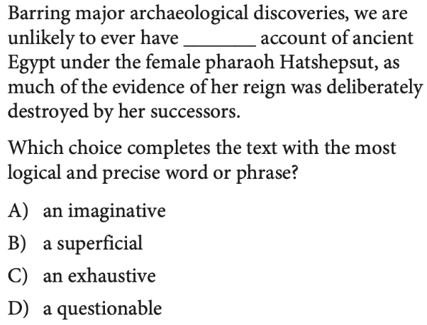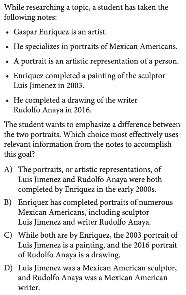 Students are always looking for shortcuts, and in SAT Reading & Writing that often manifests in a desire to read as little of the text as possible. While there are a few places where your default strategy can be to read less (on notes synthesis questions, for example, you don’t need to read the bullet points until you’ve first confirmed that there is more than one answer choice that accomplishes the given objective effectively), by and large you should be careful not to cut corners. Context matters, and most of the passages you’ll be dealing with are fairly short, which means that there typically isn’t much fluff that can be safely disregarded.