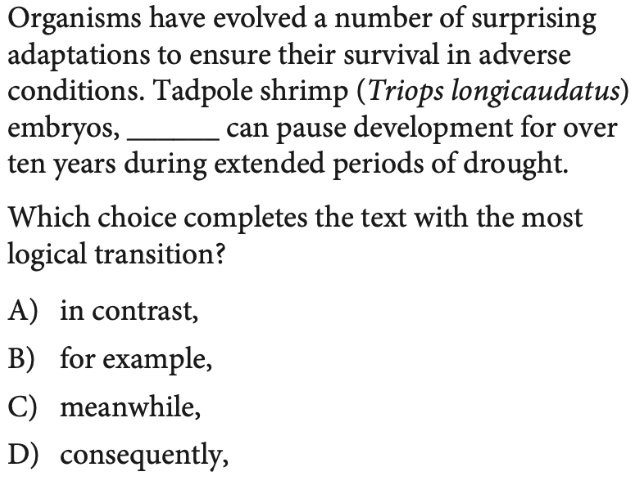 Transition questions: Very similar in structure to grammar mechanics questions, these problems ask students to complete the sentence(s) with the transition word/phrase that most logically connects the ideas presented.